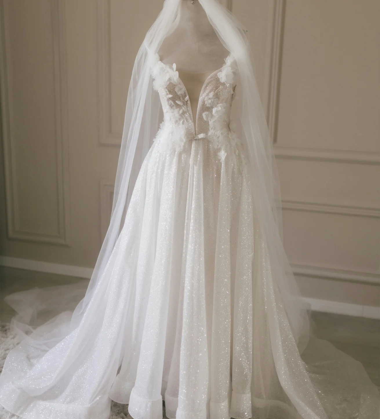 We work with bridal gowns of many styles and fabrics, including lace, tulle, satin, and beaded designs.